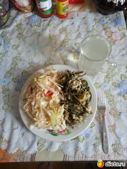 Обед - папоротник жаренный с яйцом + салат ( капуста, огурец, помидор ) + куриный бульон