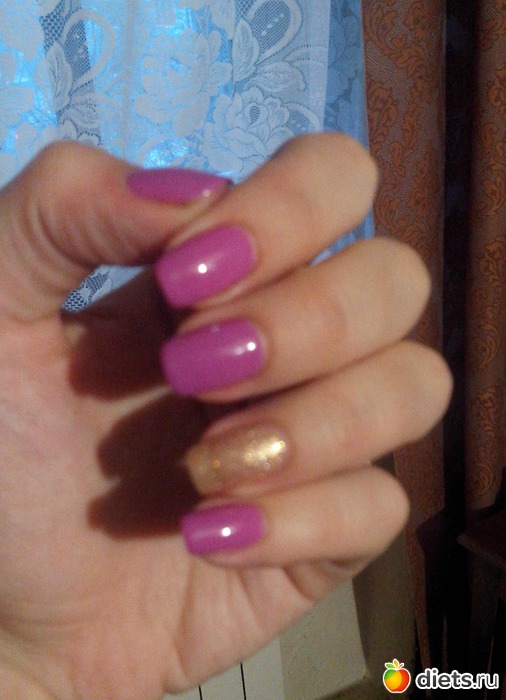 В третий раз не знаю, что было у меня в голове, но решила я покрыть ногти сиреневым цветом, а безымянные пальчики выделить золотистым.