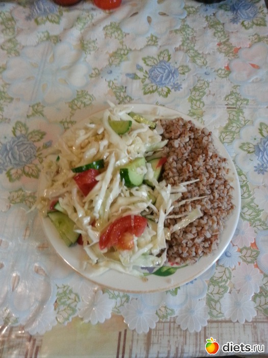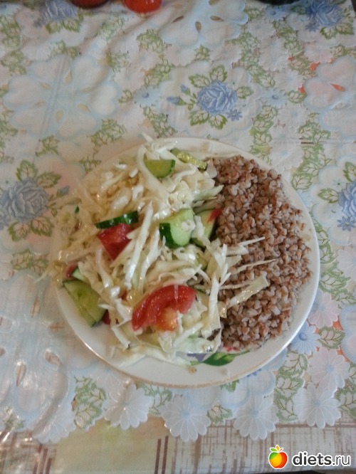 Обед - гречка + салат ( капуста, помидор, огурец )