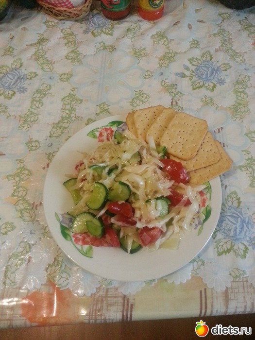 Ужин - салат ( капуста, помидор, огурец ) + 6 крекеров с беконом