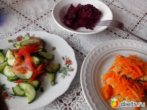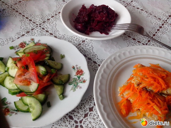 О: запеченый минтай, свекла вареная, салат из помидора и огурца без масла и соли