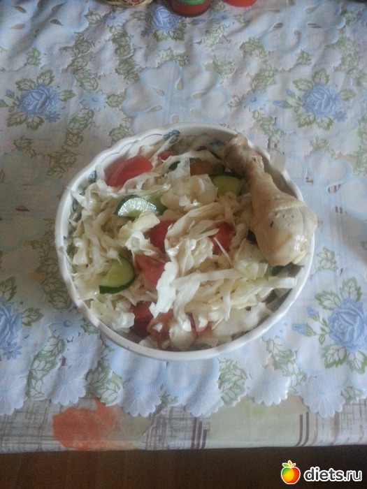 Ужин - 1 куриная ножка + салат ( капуста+ помидор + огурец )