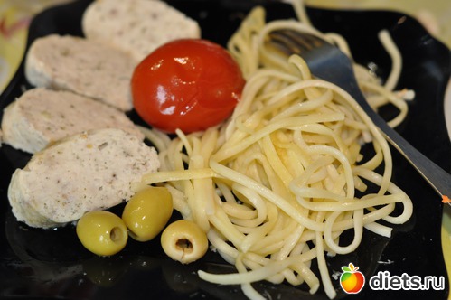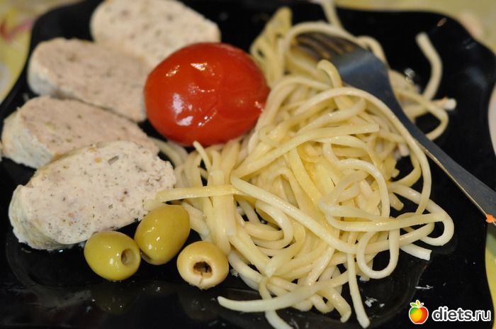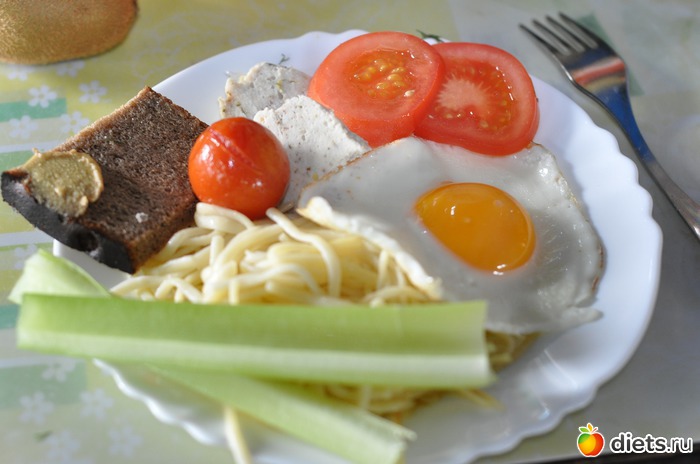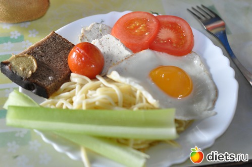 Какая-то сбалансированная тарэлка с едой: яйцо, цельнозерновые спагетти, сельдерей, помидорка, колбаска из курогруди ))