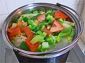 Все это крошится, заливается водой, приправляется солью, перцем, можно также добавить карри, тмин, кориандр, имбирь, кинзу, чеснок, лавровый лист, соевый соус, чили или тобаско – любое, что вам нравится из этого списка. Колечки лука позволительно слегка обжарить на чуточке оливкового масла. Даем покипеть на сильном огне 10 минут, после чего накрываем крышкой и на малом огне оставляем вариться, пока все овощи не станут мягкими.