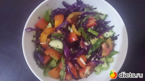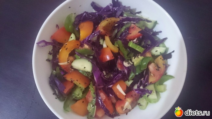 Ужин салатик :огурцы, помидоры, перчик, краснокачанная капуста, чесночок, семена кунжута и 30 грамм сыра.