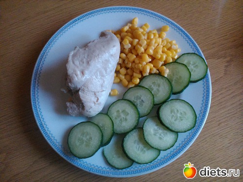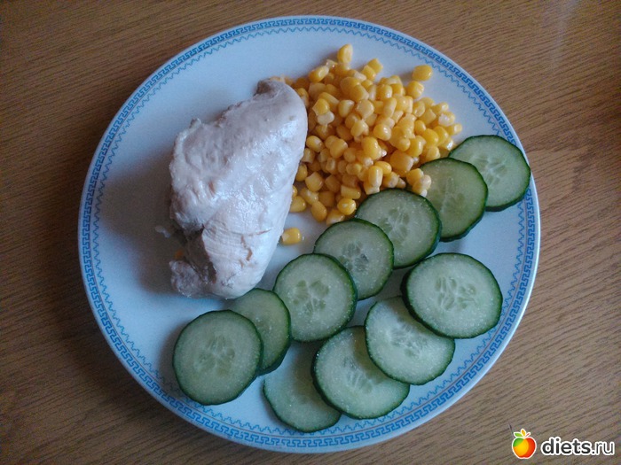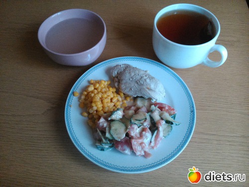 Обед - куриный бульон, грудка вареная, кукуруза, салат, чай...