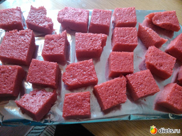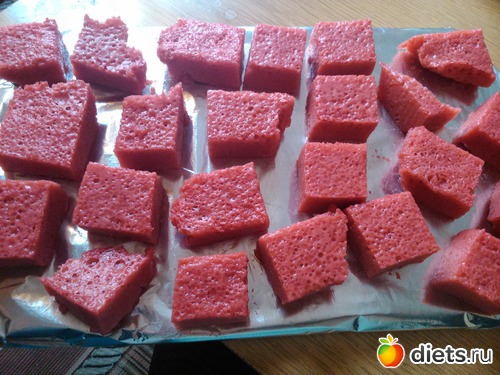 6. Теперь нарезаем кубиками, можно обвалять в кокосовой стружке или полить растопленным горьким шоколадом, не очень щедро