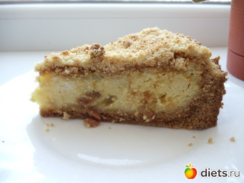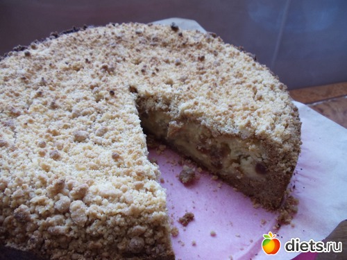В разъемную форму(смазать маслом) положить половину теста(то что крошка),сделать бортики,прижимая тесто к форме,вылить начинку и сверху посыпать второй половиной теста-крошки. Выпекать до готовности(проверить лучиной). Смачного.