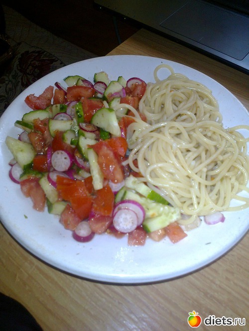 О - салат из 1/2 огурца, 8 редисочек и помидора, специи, раст.масло и соевый соус + спагетти