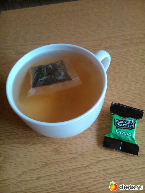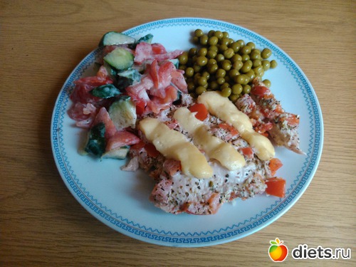 Обед - куриная грудка запеченная в духовке с помидором, натуральным йогуртом, чесноком, специями и сыром, зеленый горошек, салат, на десерт халва в шоколаде (20 г) и чай...