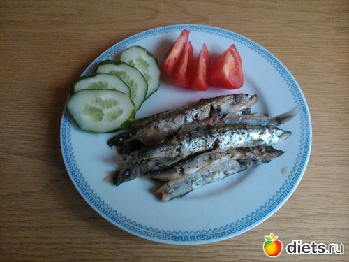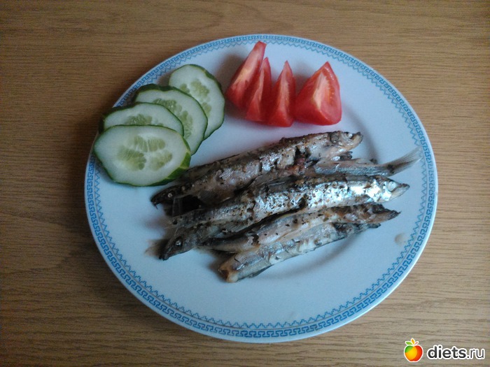 Ужинать особо не хотелось, но знаю что надо так, что мойва (приготовила на сковороде с небольшим количеством воды и специями), огурчик, помидорчик...