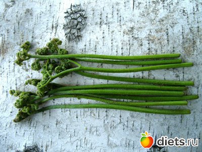 Калорийность папоротника - 34 ккал. Пищевая ценность папоротника: белки - 4,55 г, жиры - 0,4 г, углеводы - 5,54 г.