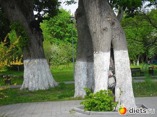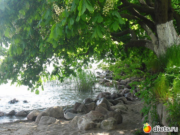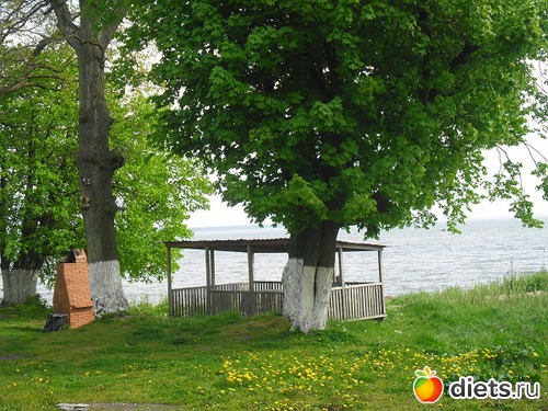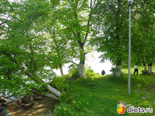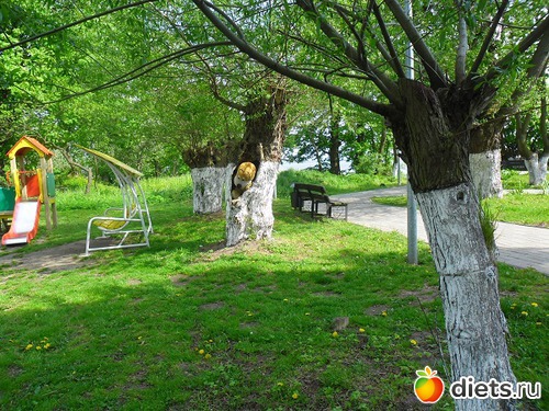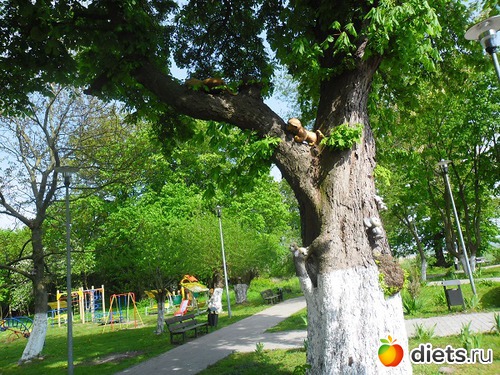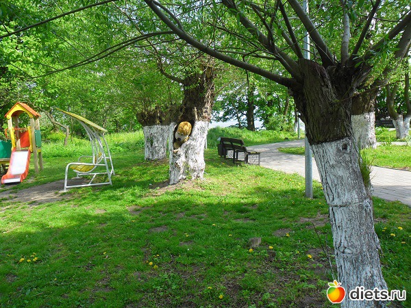 Для малышей игровая площадка, на всех деревьях по всему берегу висят и сидят игрушки.
