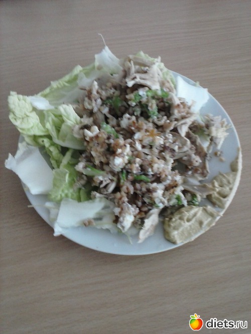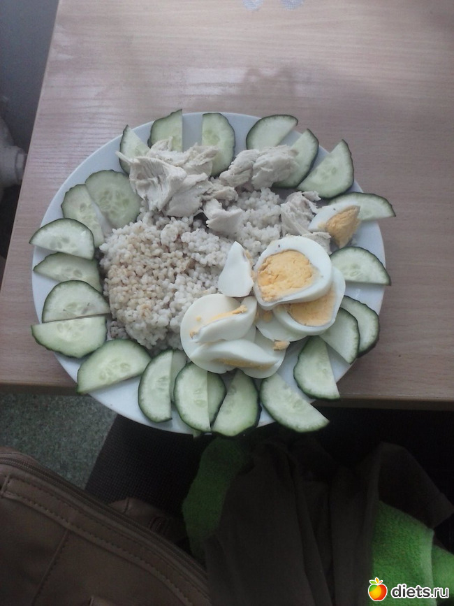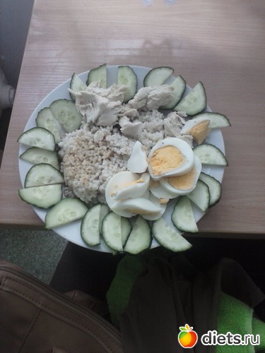 Основу первого дня составила греча, в размере 35 грамм сухого продукта, 2 яйца ( только белки), курица - около 250 грамм и салат. На ужин- творог 0,5 % и немного несладкого джема.