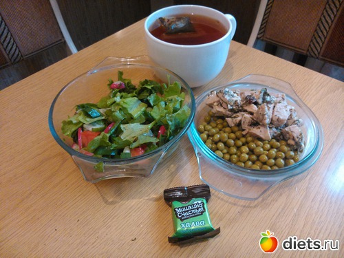 Обед - куриная грудка с опятами, тушеная в натуральном йогурте, зеленый горошек... Салат из помидора, огурца, садовой редиски и садовой зелени.. Наконец-то своя зелень пошла и редиска - намного вкуснее покупной!!! И сразу, как-то летом повеяло.. Заправила ложечкой подсолнечного масла, НЯМ-НЯМ!!! Чай и халва в шоколаде на десерт!!!