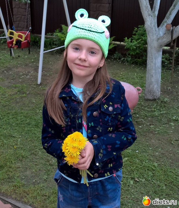 А вот шапочка, которую я ей связала для костюма. Сегодня весь день в ней ходит.