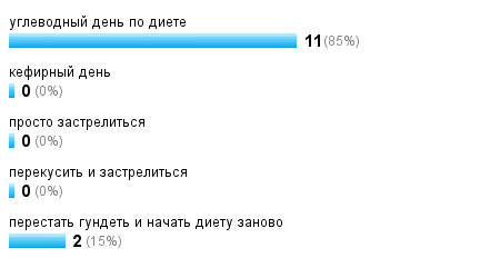 а сегодня продолжение банкета, я чувствую себя поросёЙ. Завтра в принципе у меня углеводный день, не знаю, может просто кефирчику попить, а не то от слова "УГЛЕВОДНЫЙ" меня в дрожь бросает. Или продолжать следовать меню?, как Вы девчата думаете?
