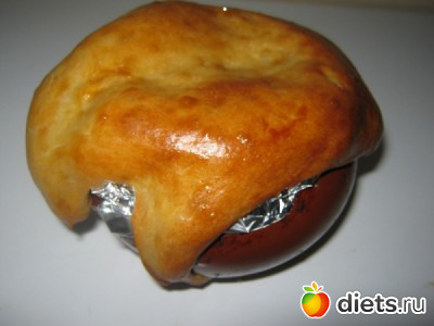 Лук мелко нарезать. Жаркое достать из духовке спустя 30 минут. Острым ножом сделать много дырочек в фольге. Тесто достать раскатать выложить на него лук и залепить, положить на фольгу сверху горшочка, самазь я йцом и в духовку на 30 минут.
