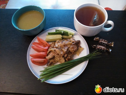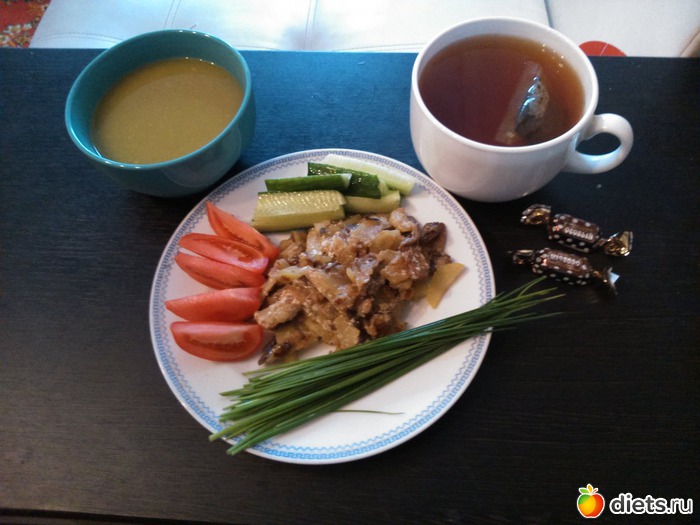 Обед - суп-пюре (тыква, брокколи, кабачок, морковь), помидор, огурец, зеленый лук, 1 картофелина с шампиньонами и натуральным йогуртом, чай, 2 конфетки...