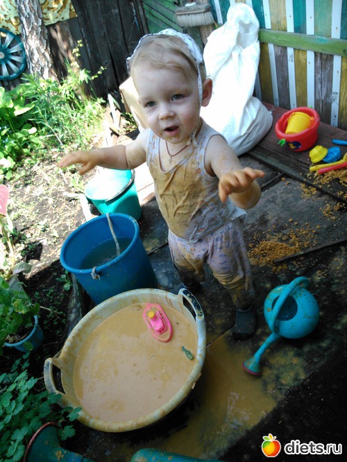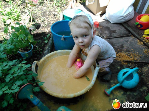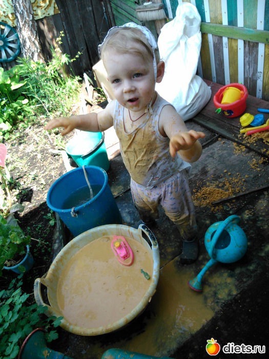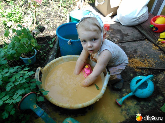 , булькался в ведрах, тазиках, песочек тоже превратился в месиво...