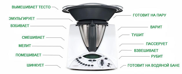 Термомикс позволяет взвешивать, пассеровать, варить, тушить, вымешивать тесто, взбивать, выполняет функцию мельницы, эмульгирует, шинкует, дробит, измельчает, следит за температурой и взбивает. Вам не нужно использовать множество емкостей или кастрюль, поскольку теперь всё можно сделать в одной чаше.