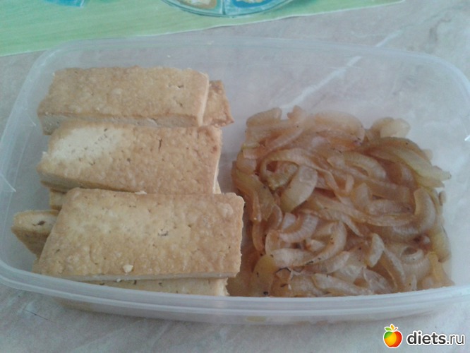 пожарила его на антипригарке с каплей кунжутного масла (для вкуса), вкуснотища... на гарнир крупно порезала лук и немного припустила в той же сковороде после тофу... и помидорка в обед... а после обеда съела еще 2 маленьких волосатых персика (и загадала желание, наивная, первый раз в этом году их ела)...