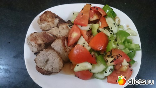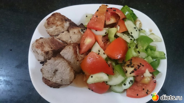 Ужин в 19 часов: 110 грамм шашлыка и немного салатика..