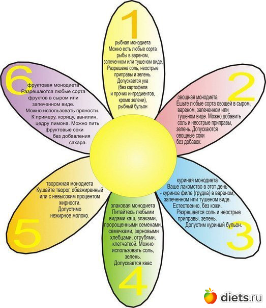 Родина диеты – Швеция, а автор этого интересного рациона питания – шведский диетолог Анна Юханссон. Идея диеты проста: каждый день «6 лепестков» - это день определенной монодиеты. То есть, каждый день вы «сидите» на одном продукте или на одной группе продуктов. Например, есть день морепродуктов, рыбный день, овощной, куриный и т.д. Всего шесть лепестков – то есть поочередно сменяемых друг друга шесть монодиет.