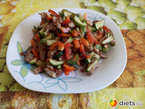 Необходимые продукты: говядина 500 г, перец сладкий красный 5-6 шт, огурцы свежие 2-3 шт, лук красный 1 шт, помидоры 4 шт, перец чили 1 шт, соевый соус 1 ст.л., чеснок 1 зубчик, соль, перец по вкусу.