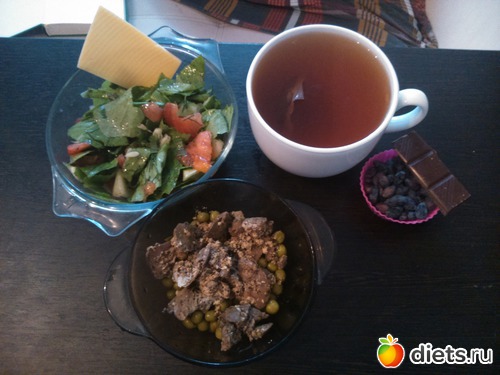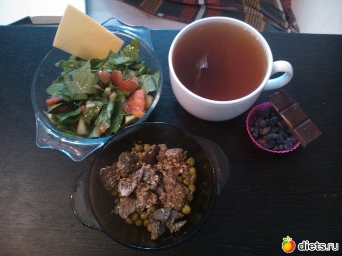 Обед - печень тушеная с натуральным йогуртом, зеленый горошек, салат, сыр, чай, темный шоколад, ягоды (жимолость)...