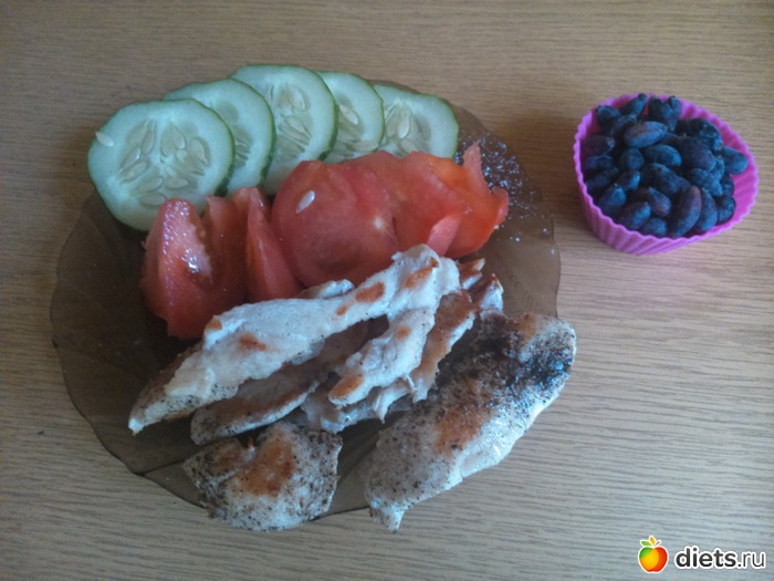 Ужин (торопилась, в магазин надо было успеть, поэтому на скорую руку) - огурчик, помидорчик, куриная грудка обжаренная на сковороде (совсем чуть-чуть масла размазала кисточкой) с черным перцем и солью, ягоды...