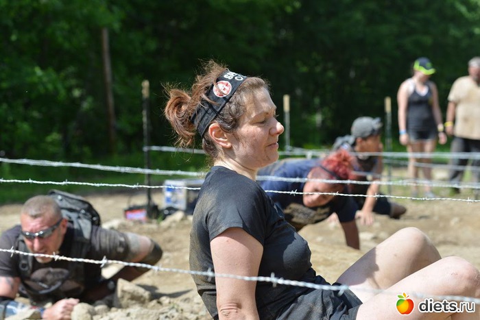 Препятствий 20. Некоторые вполене себе не сложные. А некоторые нереально сделать. Например на руках ползти, когда у тебя руки мокрые от грязи. Или на канат забраться. Мой муж смог, а я нет. Потому что была уже очень уставшая.