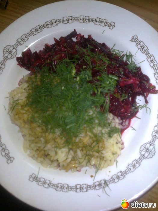 О - рис с приправками и соевым соусом (на обед вышло 4ст.л) и салатик из 1 свеколки отварной потертой и 1огурчика тертого с маслицем, укропом (точнее его половина).