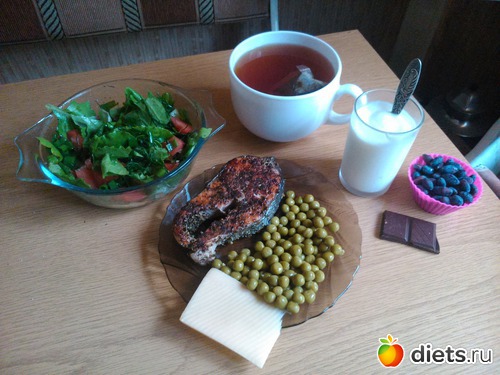 Обед - красная рыба в специях жаренная на сковороде, зеленый горошек, сыр, салат, чай, натуральный йогурт, ягоды, шоколад...