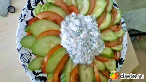 Решила я, что сегодняшний завтрак будет именно такой)) Огурчики и Помидорки + "соус" из творога, кефира и зелени!)Вкуснота!)