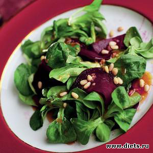 3. Выложить на большой тарелке гору из салата корн. На салат набросать ломтики свеклы, посыпать сверху кедровыми орешками, залить соусом и небрежно — большими салатными ложками — всю эту компанию перемешать.