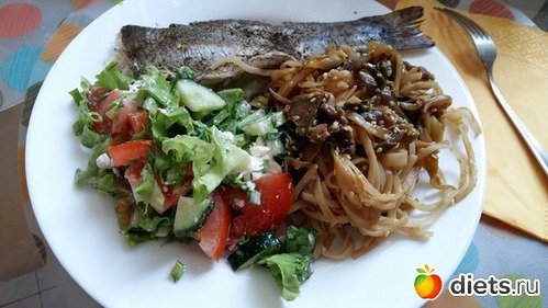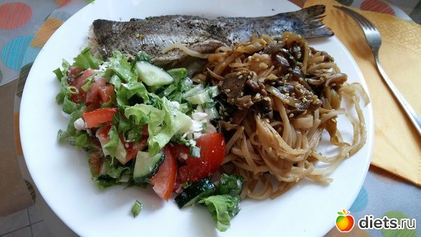 Обед: форель запеченая в фольге + рисовая лапша с кабачками и синими с соевым соусом и кунжутом + салат овощной с сыром фета