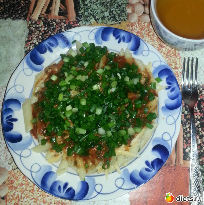4. Выкладываем на тарелку холодные макароны, сверху посыпаем сыром, затем поливаем горячим соусом, и в заключении покрываем все зеленым луком!!
