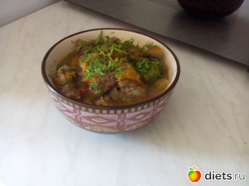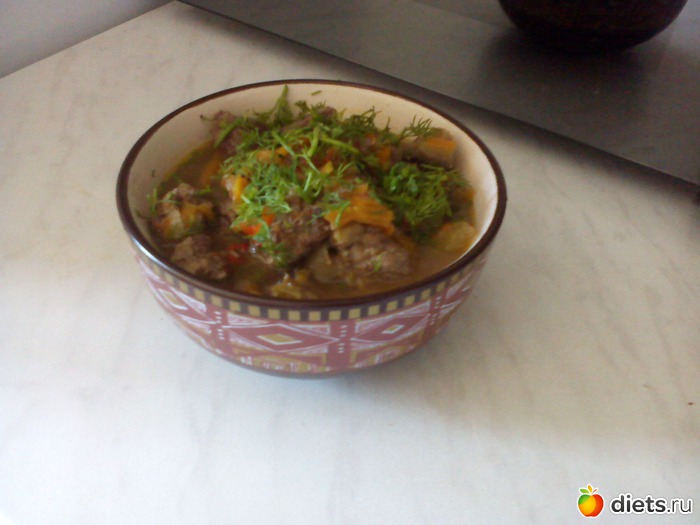 Продукты: говядина 500 г, морковь 1 шт, лук репчатый 2 шт, баклажаны средние 2 шт, помидоры 2 шт, зелень 1 пучок, чеснок 4 зубчика, оливк. масло 1ст.л., соль, перец по вкусу.