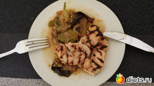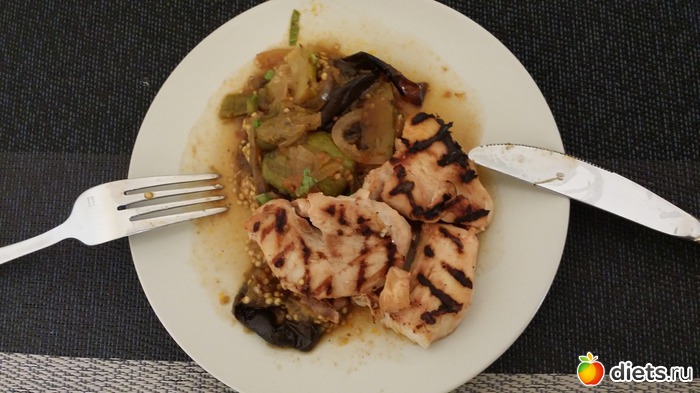 Обед, грудка на гриле без масла, ничуть не хуже, чем с маслом, и соте из баклажан и кабачков.