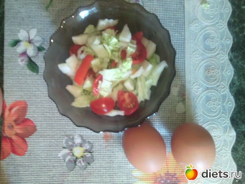 салат из помидорок и китайской капусты, два варёных яйца, хлеб( непонятно какой), пряник и зефирка, всё хотелось мне чего-то, непонятно чего