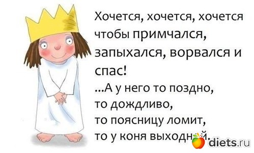 — Прекрасный принц, я тебя вижу первый раз в жизни, и вести о тебе никак не дошли до моего королевства! — съязвила принцесса. — Я не могу сейчас замуж! У меня скоро сплав по высокогорной реке — мне надо готовиться! И поход на байдарках! И вот — конкурс резьбы по дереву еще, а стамеску папенька с собой увез!
