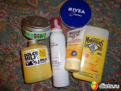 Гель для душа и крем для ног от dolce milk, обожаю запах этой продукции, гель и крем Le Petit Marseillais, крем для рук, но я использую для лица, великолепная штука, дальше пенка для умывания и крем Nivea для тела