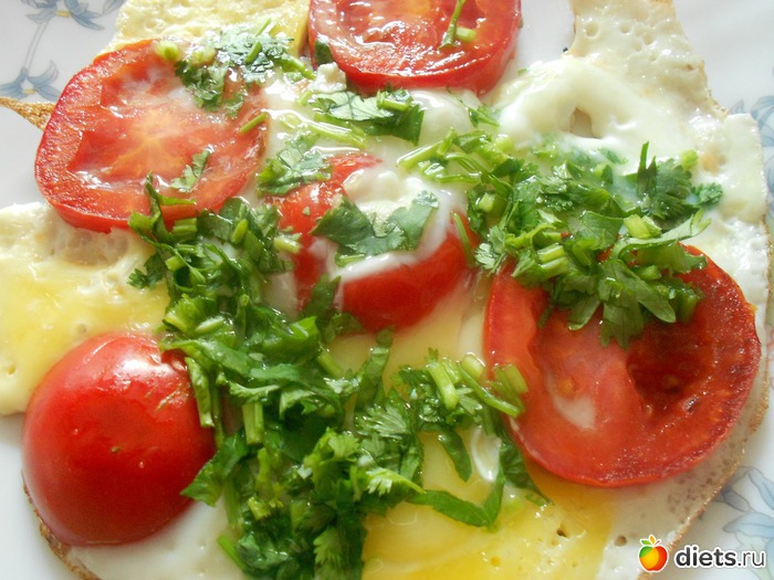 Завтрак - омлет (2 яйца и 2 ст.л. молока) на сухой сковороде, помидор (1 шт.), чай/кофе.