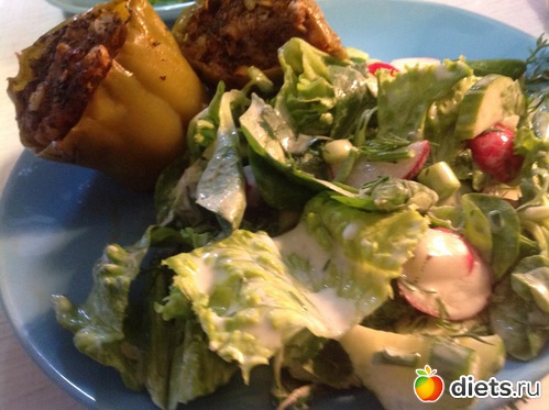 перчики, фаршированные говядиной с рисом (200 г) (ну не было у меня грудки, а перцы остались), салат, как было положено, и чай: