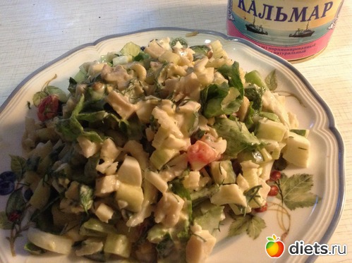 салат с кальмарами (поскольку рецепт не уточнялся, посвоевольничала: 100 г кальмара + салат, огурец, помидор, сельдерей, яйцо = 100 г),