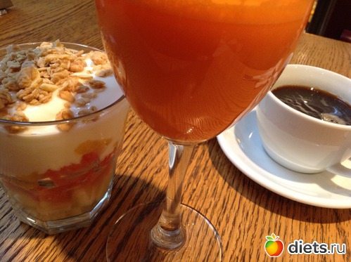 десерт "Касабланка" (фруктовый салат с йогуртом), морковный фреш, кофе: