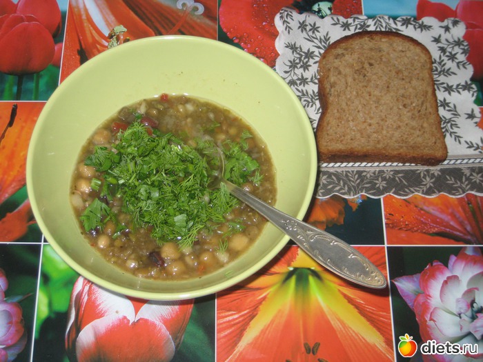 обед: суп из 3-х видов чечевицы, фасоли белой и темной, нута...хлеб...каркаде (фоткать некогда было)