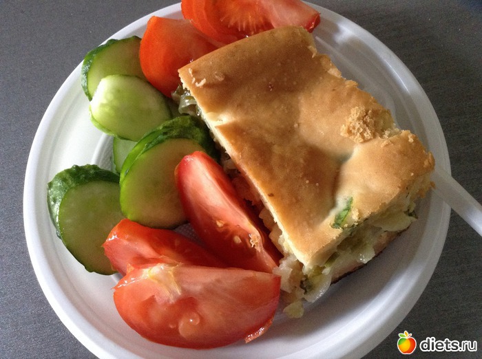 Это - капустная шарлотка на кефире: 2 стакана кефира, 1 ч.л. соды, 1,5 стакана муки для теста; капуста с крутым яйцом и зеленым луком с петрушкой, на 0,5 кг капусты - 2 яйца, 1 ст.л. растительного масла, соль-перец; половину теста выливаем в форму, затем выкладываем начинку, заливаем оставшимся тестом и печем минут 20-30. Получается вкусно и сочно, к тому же низкокалорийно.