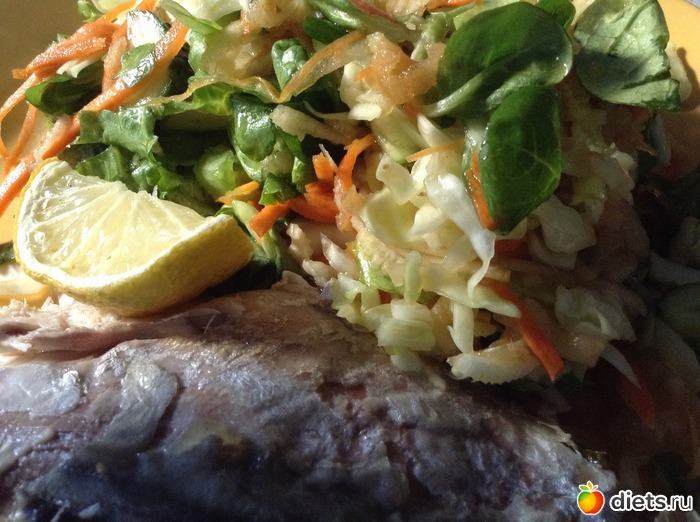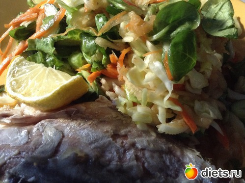 запеченная скумбрия (100г) с капустно-морковно-яблочно-сельдереево-огуречным салатом (200 г):